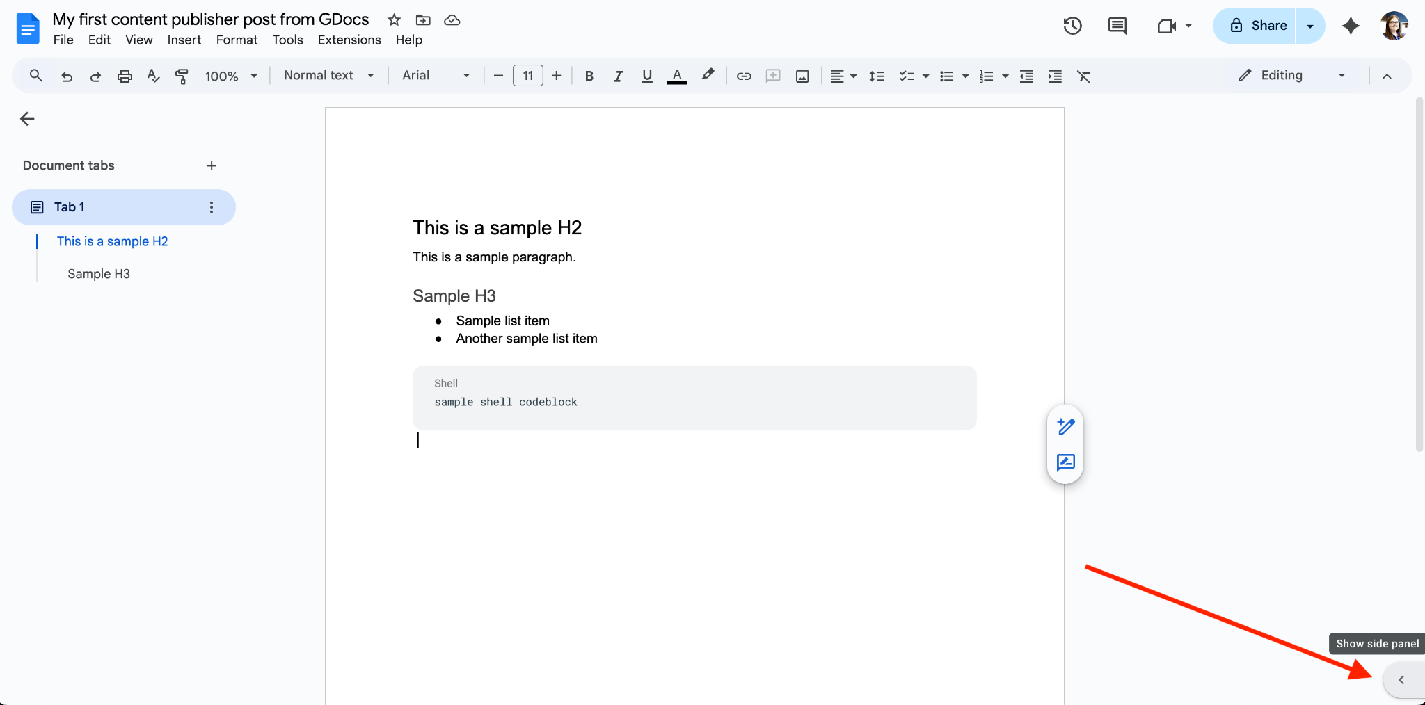 - On the lower right side of the window, click the “Show side panel” icon; this will open the right sidebar.