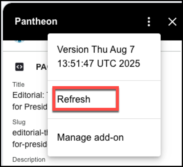 If changes are made to the collection structure externally, you may encounter issues retrieving information in the add-on. By clicking the three dots at the top of the add-on, you can refresh the add-on’s information.