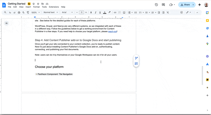 Google docs users can simply place smart components in their doc (assuming smart components are configured) by typing @pantheon which will open the smart component creation interface.