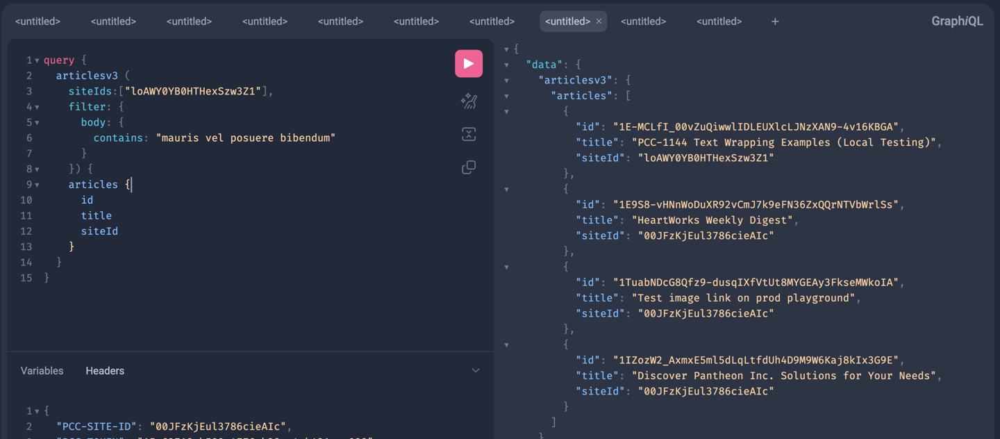 The following query shows all the arguments that can be passed for fetching or searching articles. $filters allow to perform a full text search relying on Google Vertex AI Search.