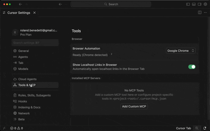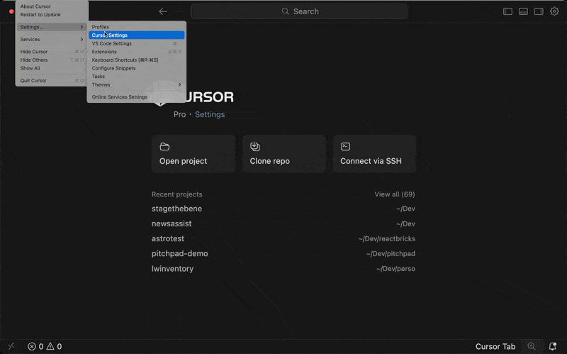 1. In cursor main menu, go to Cursor and then Cursor Settings