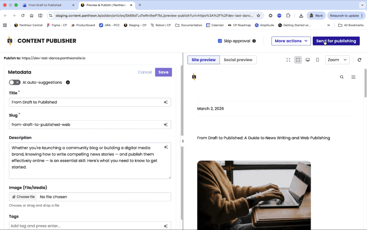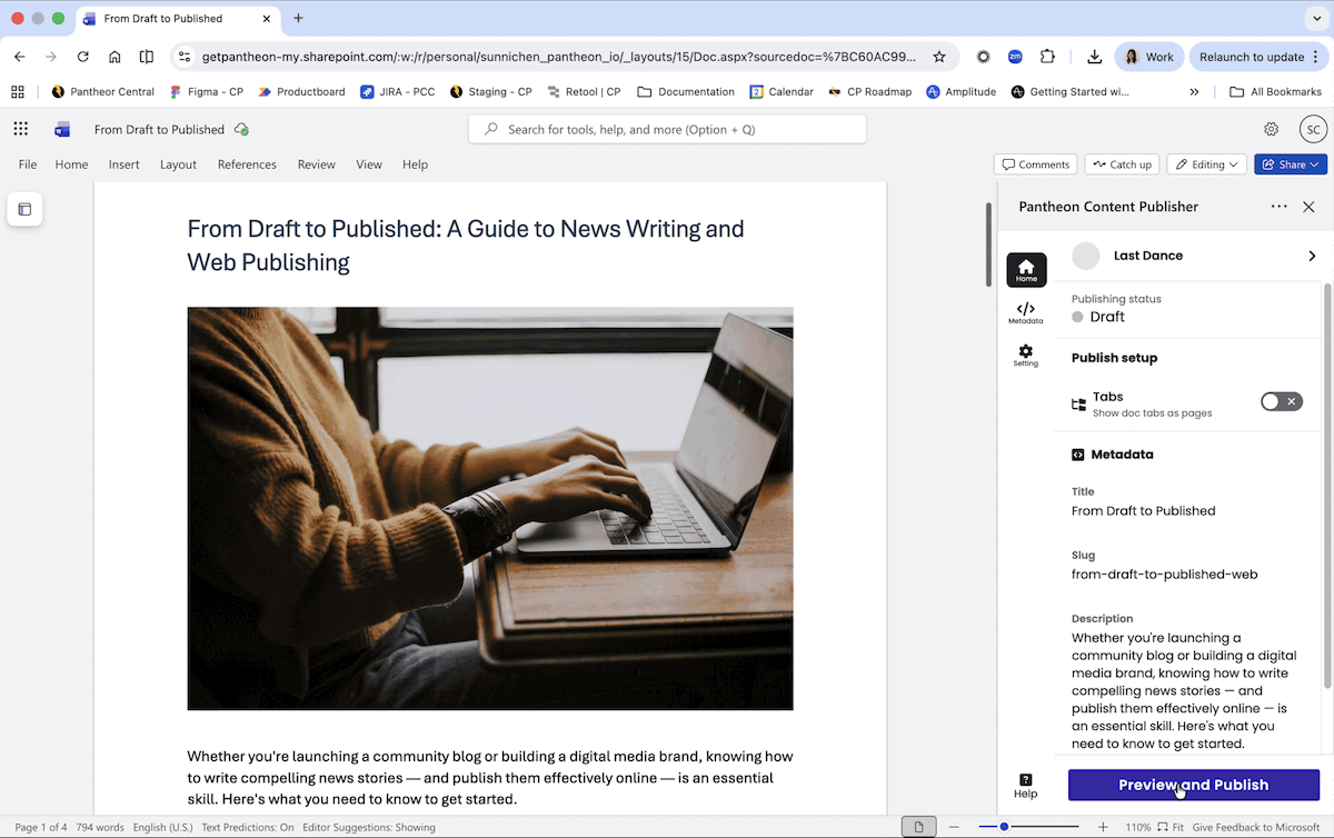 Click on the Preview & Publish button to access the preview and easily see how content from Microsoft Word will render on your website. The interface will also allow you to see how content renders on social media platforms. Contributors can also update the metadata fields and see the impact on preview.